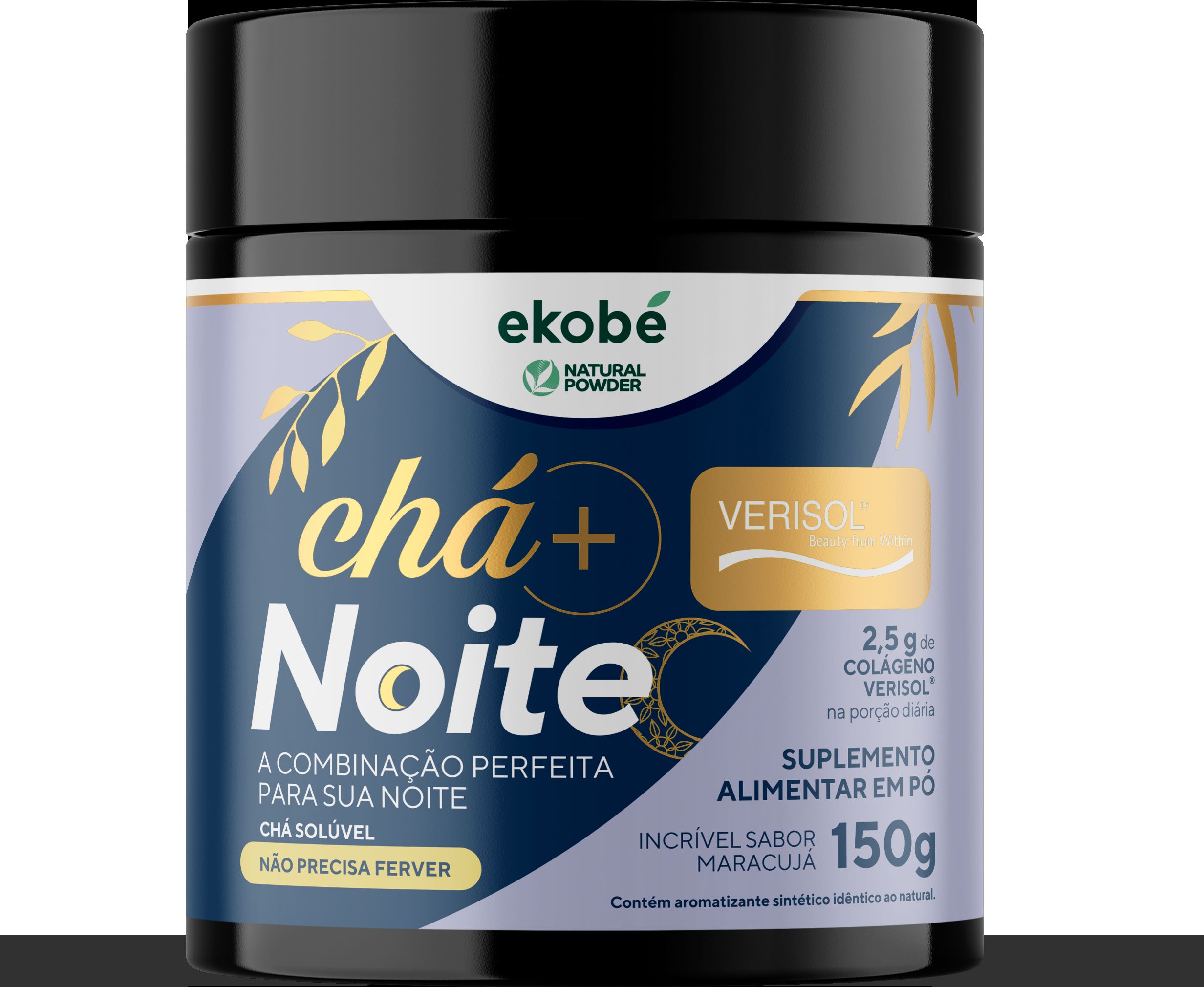 Ingredientes: Peptídeos bioativos de colágeno hidrolisado com peso molecular médio de 2kDa (VERISOL®), colágeno hidrolisado, canela em pó, melissa em pó, camomila em pó, cravo em pó, maracujá em pó, funcho em pó, aroma idêntico ao natural de maracujá, acidulante ácido cítrico, antiumectante dióxido de silício, edulcorante sucralose e espessante goma xantana.